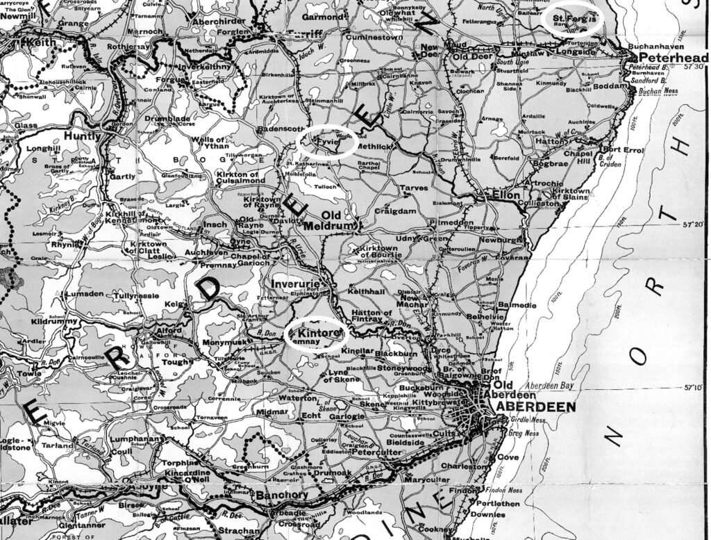 Aberdeenshire showing Kintore, Fyvie, St. Fergus and other places my ancestors lived or worked. Map is Counties of Aberdeen, Banff, Moray. London: McDougalls Educational Co., 1930. Reproduced with the permission of the National Library of Scotland. View Map: (nls.uk)
